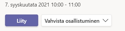 - Klikkaa ”Liity Microsoft Teams-kokoukseen”-linkkiä, jonka sait sähköpostiisi. Liittyminen onnistuu myös Teams-sovelluksessa kalenterin kautta kyseisen koulutuksen kohdalta löytyvästä “Liity”-painikkeesta (kuva 1)
