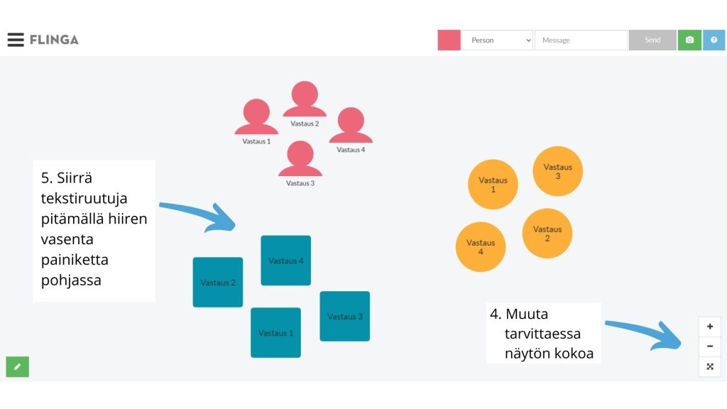 - Siirrä tekstiruutuja pitämällä hiiren vasenta painiketta pohjassa: voit vapaasti ryhmitellä ja yhdistellä tekstiruutuja Flinga-taulun sisällä.