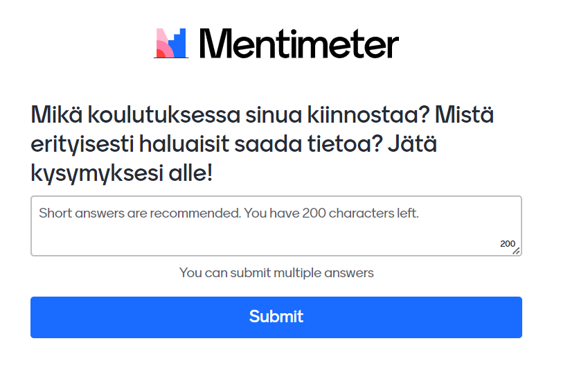 Mentimeter on virtuaalinen kyselytyökalu, jonka avulla voidaan luoda erilaisia graafisia esityksiä ja koonteja. Mentimeteriä hyödynnetään koulutusten vuorovaikutteisuuden lisäämiseen ja osallistujien ajatusten keräämiseen (nimettömänä). Pääset käyttämään Mentimeteriä kouluttajan lähettämän linkin kautta.