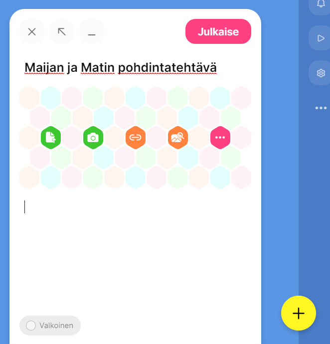 - Padlet-seinän oikeasta alareunasta löydät pyöreän Lisää julkaisu -painikkeen. Klikkaa painiketta.