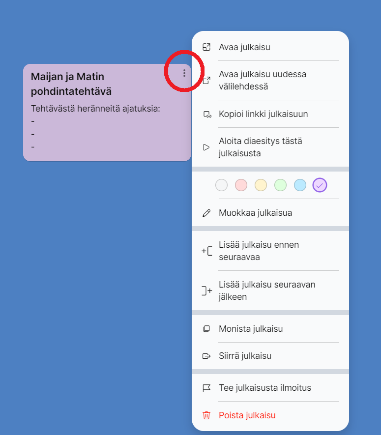 - Mikäli haluat poistaa tekstilaatikon Padlet-seinältä, klikkaa valikon alareunasta löytyvää Poista julkaisu -painiketta.
